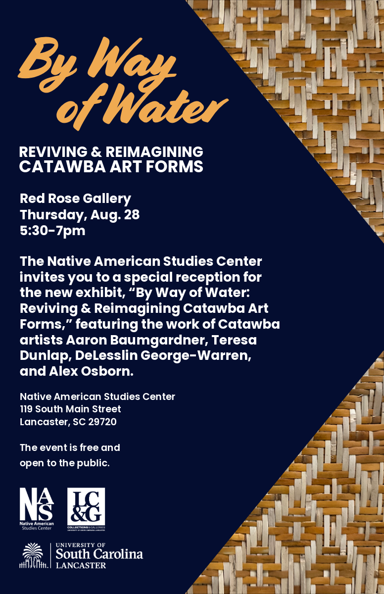 The Native American Studies Center invites you to a special reception for the new exhibit, “By Way of Water: Reviving & Reimagining Catawba Art Forms,” featuring the work of Catawba artists Aaron Baumgardner, Teresa Dunlap, DeLesslin George-Warren, and Alex Osborn.